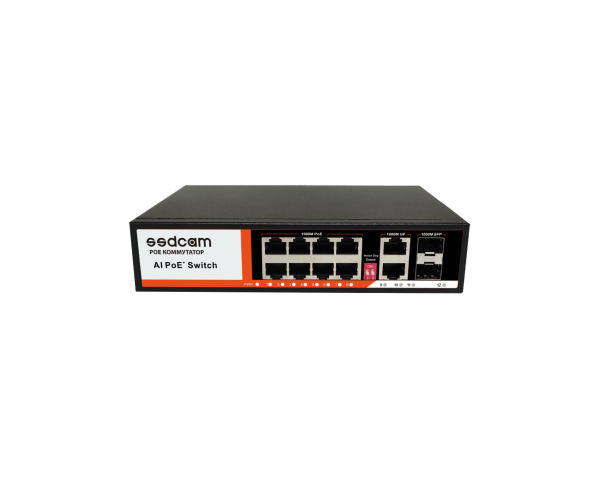 Коммутатор SSDCAM, 58PSO, PoE, 8 портов (10/100/1000 Мбит/с) + 2 порта Uplink (10/100/1000Mbps) + 2 SFP порта (1000Mbps), 48В, корпус металл