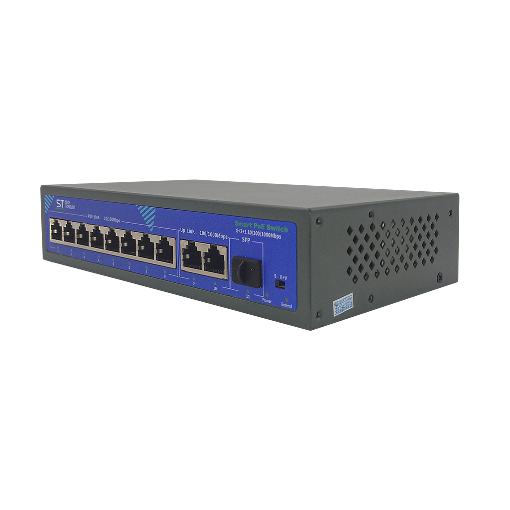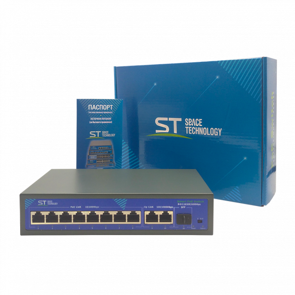 Источник питания ST-S87POE (2G/1S/120W/A)PRO, Switch POE 8-ми портовый, для обеспечения проводных сетей напряжением 48В, защита от КЗ, Extend 250м., AI PoE, AI VLAN, Грозозащита, PoE порты: 8 х (10/100 Мбит/с), UpLink порты: 2 х (10/100/1000 Мбит/с), SFP порты: 1 х (1000 Мбит/с), Max.пропускная сп-ть: 100 Мбит/канал (PoE порты)1000 Мбит/канал (UpLink и SFP порты), Uвых: 48 (±10%), Р(ном) каждый порт (Вт): 19, Р(макс) каждый порт (Вт): 30, Р(сумм) общая (Вт): 120, Тип РоЕ: А, Коммутационная способность (Гбит/с): 12, AI PoE(watchdog)/Vlan/Extend, Система охлаждения: пассивная, Металл, Температура эксплуатации: От -45°C до +55°C, Габариты изделия, мм.: 200х118х44 мм